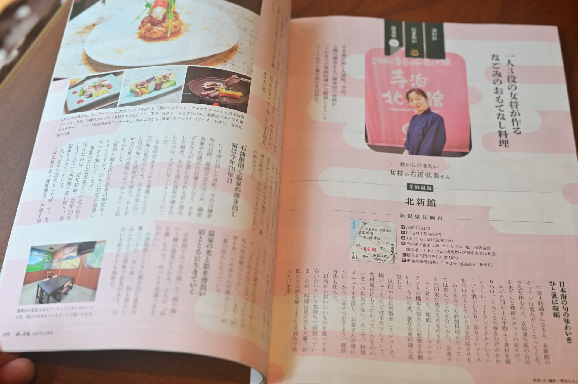 このたび、旅の専門誌「旅の手帖」2025年12月号にて、旅行作家であり、温泉と宿のライターとしてご活躍されている 野添ちかこさん が、当館「北新館」を紹介してくださいました。